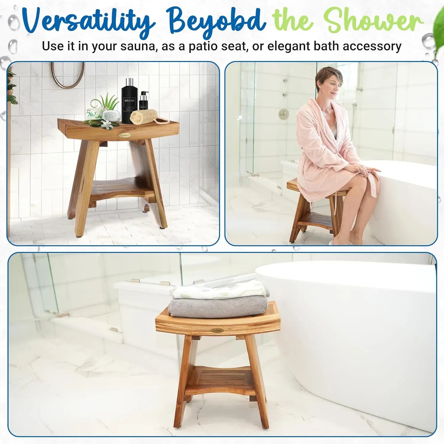 - Waterproof & Long-Lasting – Naturally high in oils and dense grain, this teak shower bench resists moisture, mold, and mildew, making it perfect for indoor showers and bathrooms.